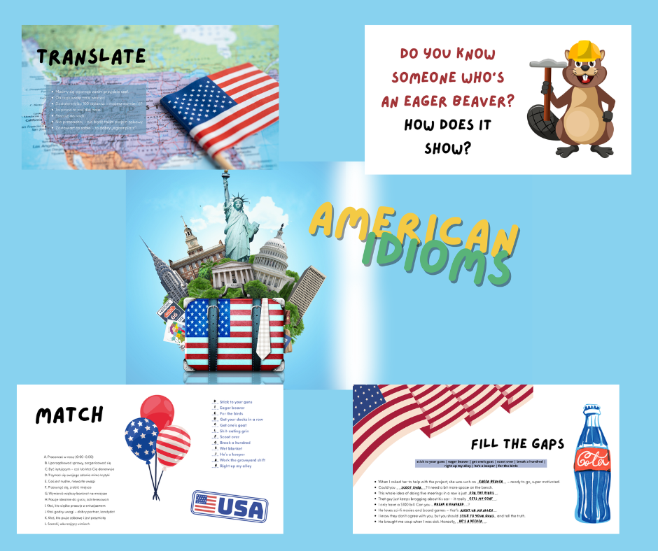 American Idioms – prezentacja w Canvie na podstawie video to kompleksowy materiał dla nauczycieli języka angielskiego, którzy chcą wprowadzić uczniów w świat popularnych amerykańskich idiomów w atrakcyjnej, multimedialnej formie. Prezentacja bazuje na autentycznym materiale wideo, w którym Dave z Ameryki tłumaczy znaczenie idiomów takich jak stick to your guns, eager beaver, for the birds, get your ducks in a row i wiele innych.