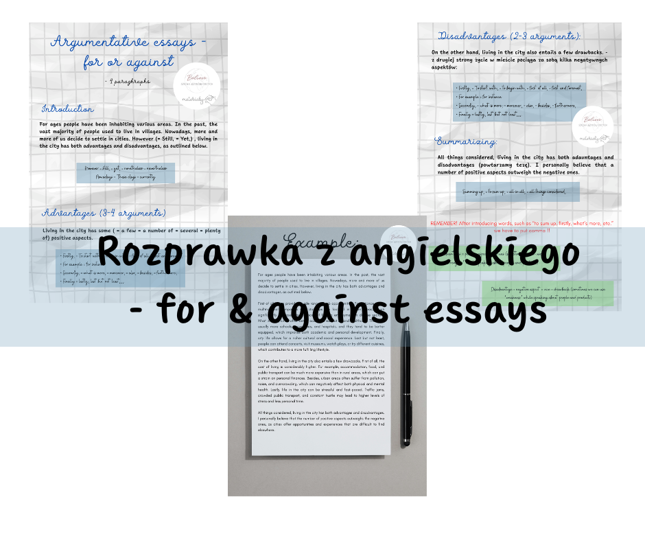 Pisanie wypracowań typu „for and against” sprawia uczniom trudność? Nie wiedzą, jak zacząć, jak uporządkować argumenty i jak poprawnie zakończyć pracę? Ten materiał został stworzony właśnie po to, aby krok po kroku nauczyć struktury eseju argumentacyjnego.