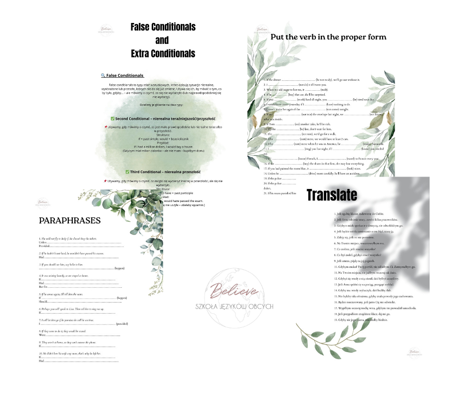 Materiał False and Extra Conditionals to kompleksowy zestaw do nauki zdań warunkowych – zarówno standardowych, jak i bardziej zaawansowanych struktur.