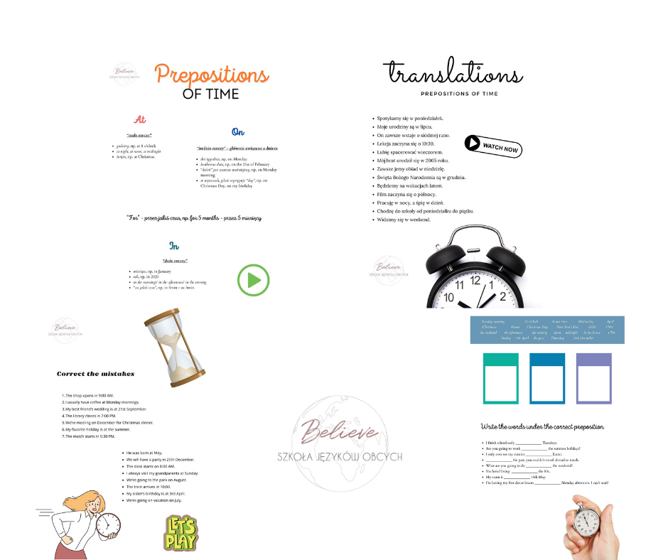 Materiał Prepositions of Time – A2–B1 to kompletny zestaw ćwiczeń do nauki i utrwalenia przyimków czasu (in, on, at) w praktycznym kontekście. Dzięki różnorodnym zadaniom uczniowie nie tylko opanują zasady, ale także nauczą się je stosować w mówieniu i pisaniu.