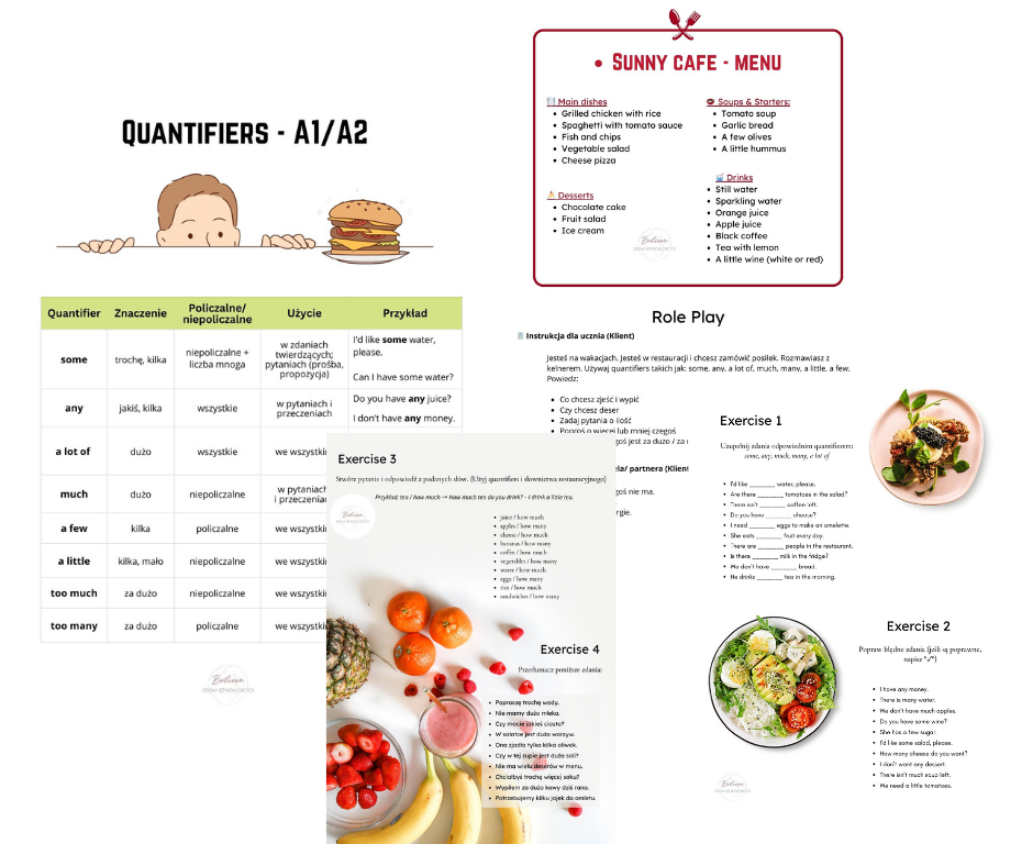 Materiał Quantifiers (restaurant & shopping) to praktyczny zestaw ćwiczeń dla uczniów na poziomie A1–A2, który łączy naukę gramatyki z codziennym słownictwem.